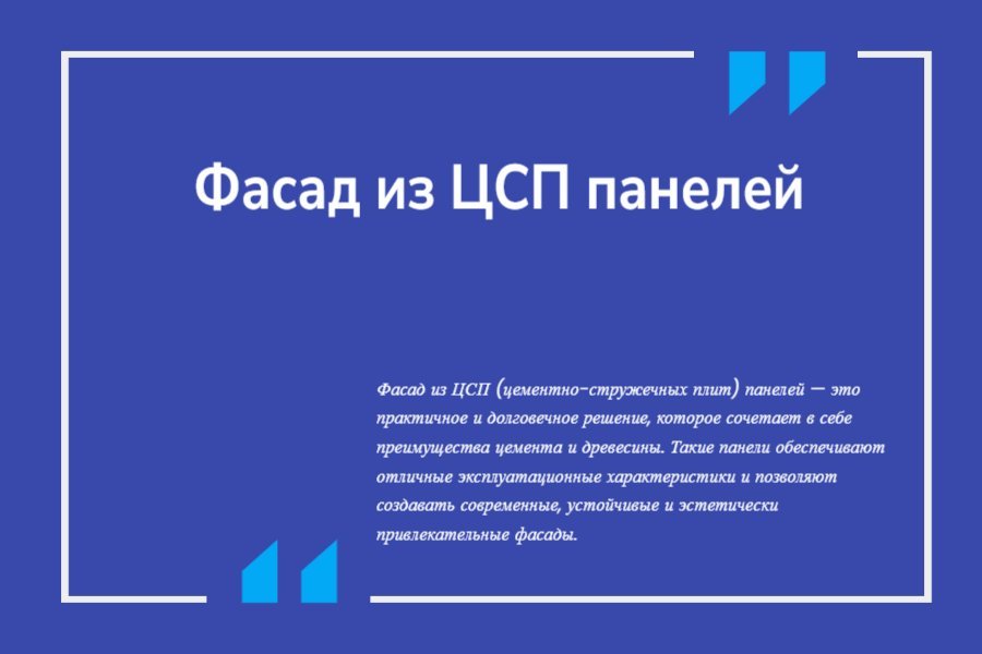 Фасад из ЦСП (цементно-стружечных плит) панелей — это практичное и долговечное решение, которое сочетает в себе преимущества цемента и древесины. Такие панели обеспечивают отличные эксплуатационные характеристики и позволяют создавать современные, устойчивые и эстетически привлекательные фасады.